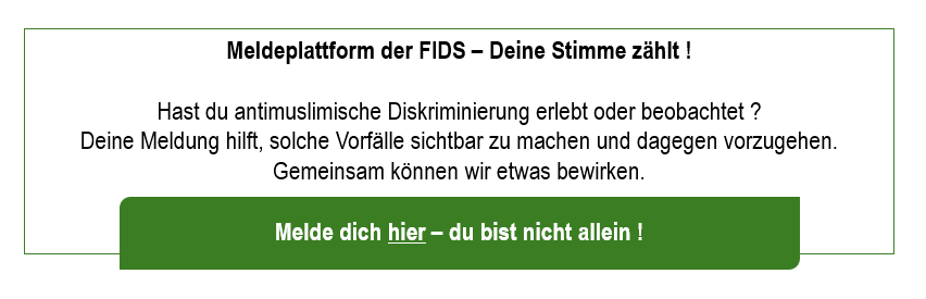 News 30.09.2025 News Dialogue en Route – Brücken bauen, Vielfalt leben! 26.09.2025 News Die Lage in Gaza wird immer aussichtsloser 23.09.2025 News Den Kuchen gerechter verteilen 22.09.2025 Die FIDS, Medienmitteilungen Kopftuchdebatte an der FHNW: FIDS nimmt Stellung 15.09.2025 News Von 9/11 bis heute: Stereotype wirken fort 12.09.2025 News Spass und Lachen verbindet Services SwissMosque Rassistische Online-Hassrede melden Medienanfrage Anlaufstelle – Meldeplattform Themen Bundesweite Themen Interreligiöser Dialog Islamische Themen Anmeldung für den Newsletter Anmelden www.CleverReach.de