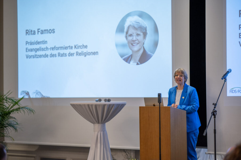 Anschliessend richtete Rita Famos, Präsidentin der Evangelisch-reformierten Kirche Schweiz und Vorsitzende des Schweizerischen Rats der Religionen, einige Worte an die Gäste. In ihrer Rede hob sie die vielen Gemeinsamkeiten zwischen den Religionen hervor und verwies darauf, dass in diesem Jahr die christliche Fastenzeit und der Ramadan nahezu zeitgleich begonnen haben, zwei spirituelle Wege, die beide zur Besinnung, zum Innehalten und zur Gemeinschaft einladen. Mit Blick auf das Thema des Abends betonte sie, dass die Debatte um das Kopftuch zentrale Fragen von Freiheit und Selbstbestimmung berührt. Religiöse Kleidung gebe es in vielen Glaubenstraditionen, etwa bei Ordensfrauen, Diakonissinnen oder durch religiöse Zeichen wie die Kippa und sie sei Ausdruck einer persönlichen Glaubensentscheidung. Abschliessend unterstrich sie, dass ein friedliches Zusammenleben in einer vielfältigen Gesellschaft nicht allein durch Toleranz entstehen könne, sondern vor allem durch echtes Interesse, gegenseitigen Respekt und die Bereitschaft, einander zuzuhören.