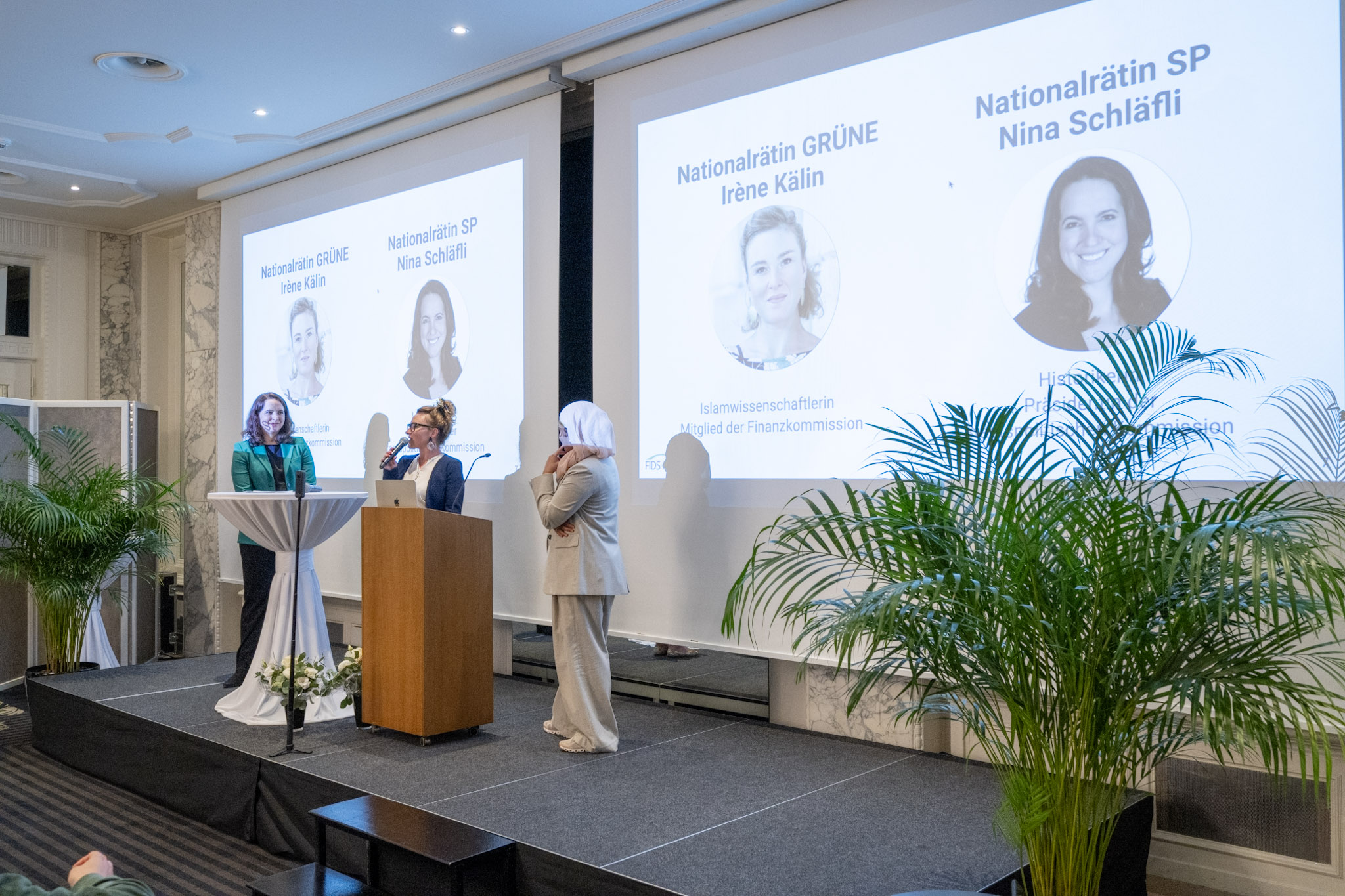 Im anschliessenden Gespräch beantworteten die beiden Nationalrätinnen Irène Kälin und Nina Schläfli Fragen der FIDS-Generalsekretärin Fathima Ifthikar. Dabei ging es unter anderem um gesellschaftliche Wahrnehmungen, politische Debatten und die Herausforderungen, mit denen muslimische Frauen in der Öffentlichkeit konfrontiert sind. Die beiden Politikerinnen teilten ihre Einschätzungen zur aktuellen Diskussion und gaben wertvolle Hinweise, wie muslimische Akteur:innen mit den kommenden gesellschaftlichen Debatten konstruktiv umgehen können. Die Diskussion machte deutlich, wie wichtig offene Gespräche über unterschiedliche Perspektiven sind, um gegenseitiges Verständnis zu fördern.